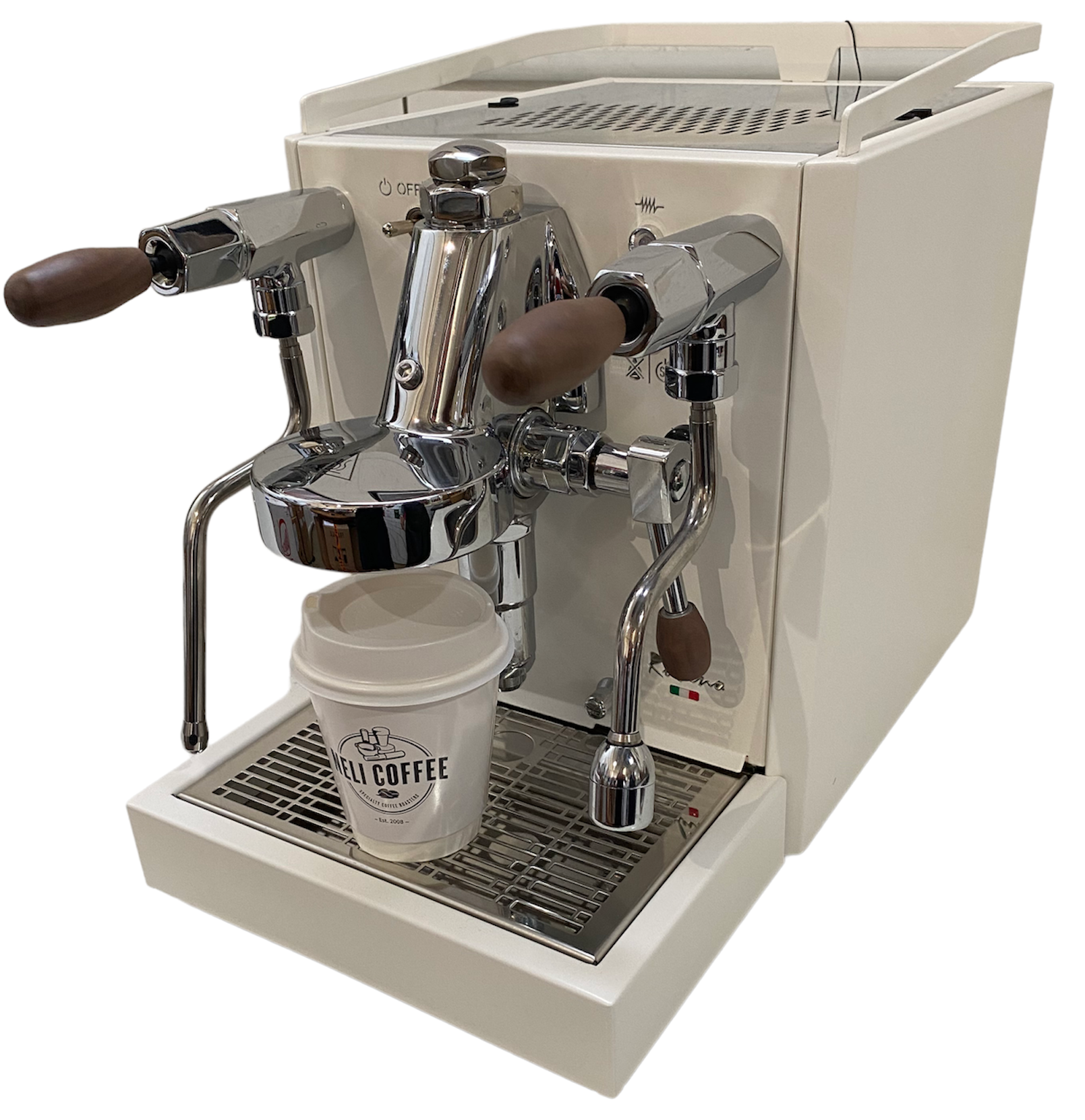 The Rubino is a compact HX machine which has some great features, big 1.8L insulated boiler, 3Ltr removable water tank, trusted E61 group head and excellent steam pressure just to name a few. Now it’s also available in a limited edition full white body. This version features custom walnut timber lever steam and water taps as well walnut features on both group handles and the brew lever.