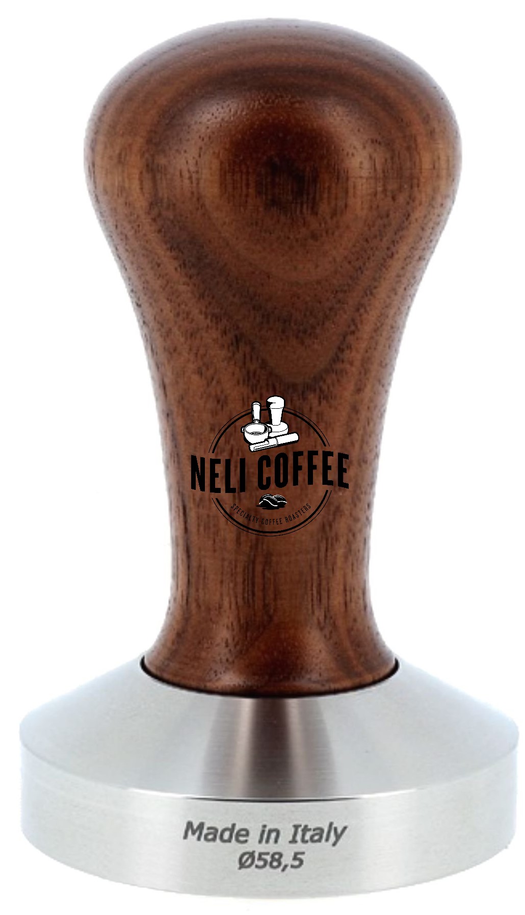 Flat stainless steel tamper base and removable Walnut Wood handle